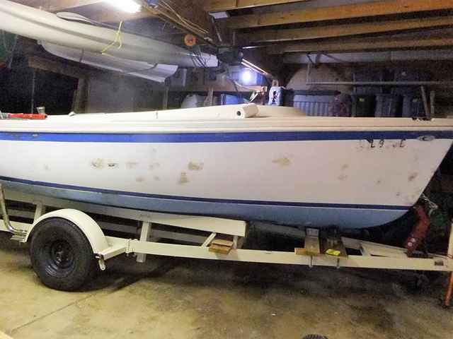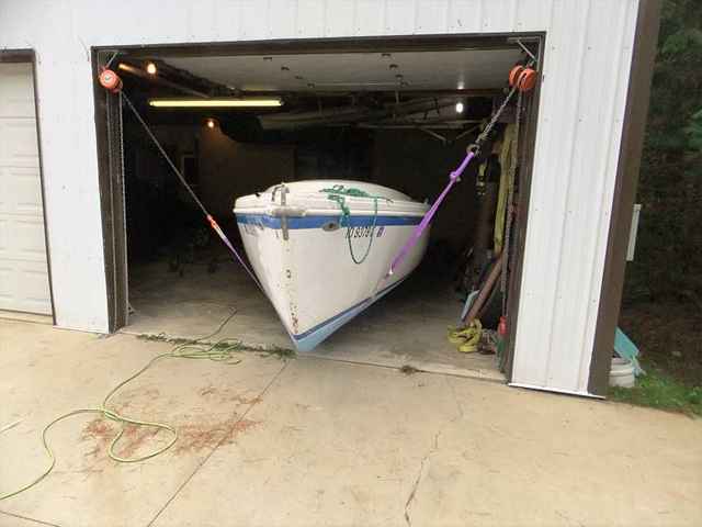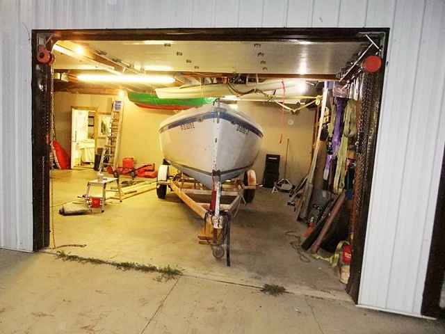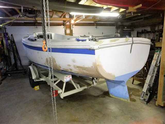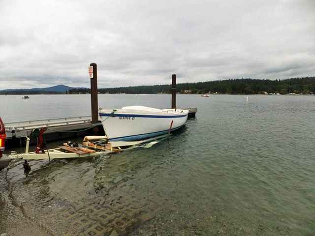 This is that same view, from about as close as this kid can wriggle - with the boat in the way. Sometimes, being ahead of the pack just doesn’t prove so much. Anyhow, this whole marathon with the trailer was simply to allow for quick in-the-water tests of the hull. First I need to look for leaks in my rather large patch job done to the bottom of the now truncated keel. Then, I’d like to do a short “sea trial” with motor in place to see if the rudder is going to be adequate, how high she sits with and without ballast, and stuff like that.