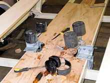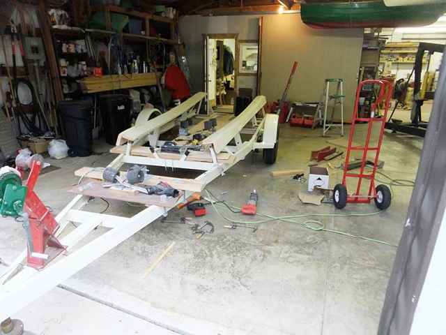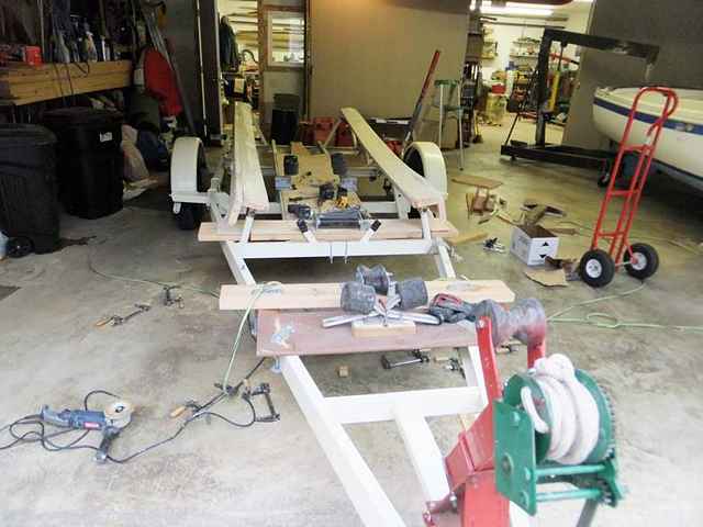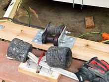 I was in the process of inventing, manufacturing, and installing a series of home brew rollers that should guide the boat into the center line as she comes back aboard the trailer, and make the slams against the trailer cross bars much more agreeable by substituting rollers, chocks, and lotsa large bolts and nuts. While it did take at least five times longer than the Planning guys so confidently predicted only last night; things were actually looking “put together” enough to try a test fit.