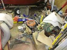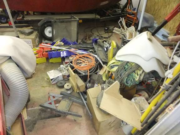 The radial arm saw was unearthed from about 100 board feet of off cuts and “valuable” sticks. An entire 25 foot wall of shelves holding thousands of pounds of “spares,” and “important” pieces of motors, door locks, trailers, boats, and every imaginable thing in between got completely cleared and re-figured out.