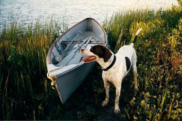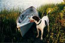 While tearing off the old scarred wood I found again a grizzled spot on the poling deck left by my eleven year old pointer when she was a needle -toothed pup.