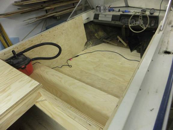 Yep, that's a floor jack under the seat. I still have to tweak the foredeck a bit to take 40 years of gravity-sag out. Dunno if there will be lift lids in the seat, or a drop-front panel. Probably lift lids and an angled seat back/full width cushions.