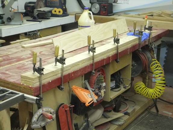 I get nothing but excuses from the Engineering Department over a bunch of no-'count stuff called "trim, and balance." They think I put too much weight in the stern. I tell 'em, "That's OK, go ahead and put more stuff in the pointy end too." The lumber yard guy told me that those ¾" AC sheets are over 50 pounds apiece. Subtracting, about 10 pounds per sheet in sawdust and off cuts, that's only about an extra couple hundred pounds, so far. And, besides, Gene is the one who gets to take the Dallas cheerleaders in his boat, I don't probably get to take so many passengers. So, anyway, after messing around with those exotics, like measuring and fitting and planning; progress sort of slugged down a bit today.