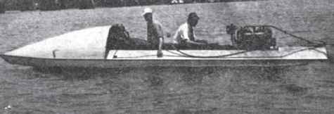 The skeptics who had been watching the building of the craft, making jokes and advancing many more or less (principally less) sound reasons why it couldn't possibly go were very much surprised to see us running up and down the waterfront, a few minutes after launching at a speed that was variously reported at from 25 to 35 miles an hour. Actually we did slightly under 20 and a subsequent shifting of the motor a little far ther forward improved the planing angle and gave us our 23 miles. This boat was used for two years as a runabout on the Susquehanna and the Chesapeake near Havre de Grace and was finally swamped when the motor stalled in a tide rip on a very windy, rough day late in December, resulting in a very uncomfortable hour for the owner and guest, who were finally rescued by a fisherman, who "allus did know young Breese was a fool and was a goin' to git drowned in his fool contraptions."