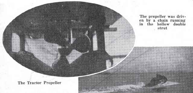 The photographs clearly show that this boat got up on the steps, planed with very little change of trim and generally acted as a well behaved hydro should. As far as I know this was the first successful hydroplane in this country and I feel quite sure the first example of the engine being placed in the stern, now an almost universal practice in gliding boats. The tractor propeller, as remarked above, must have been very efiicient, for certainly the chain drive, although carried on ball bearings throughout, must have used considerable power owing to the necessarily small diameter of the sprock ets. An interesting point about the propeller was the fact that the slip was but 10 per cent, being considerably lower than on any boat I have since known anything about.
