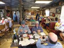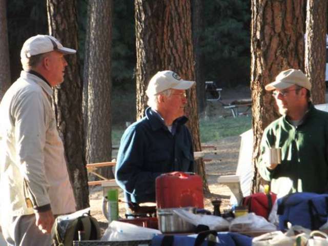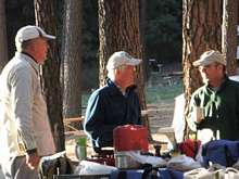 (l-r) Kim Apel, Tom Vetromile, and Tom Gale prepare breakfast and share a gam, Porcupine Bay, Lake Roosevelt