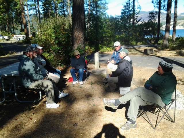 Morning "Brain Trust" meeting, Hunters camp ground, Lake Roosevelt