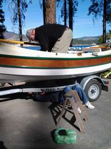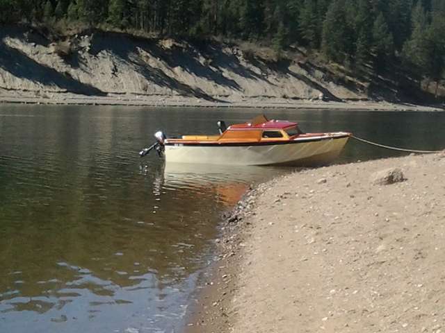 Dan's 1959 Glasspar Seafair, Old Salt, beached for lunch near Porcupine Bay, Lake Roosevelt