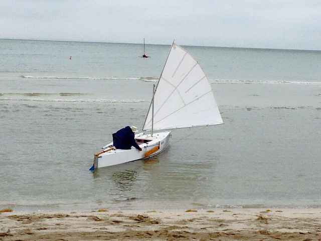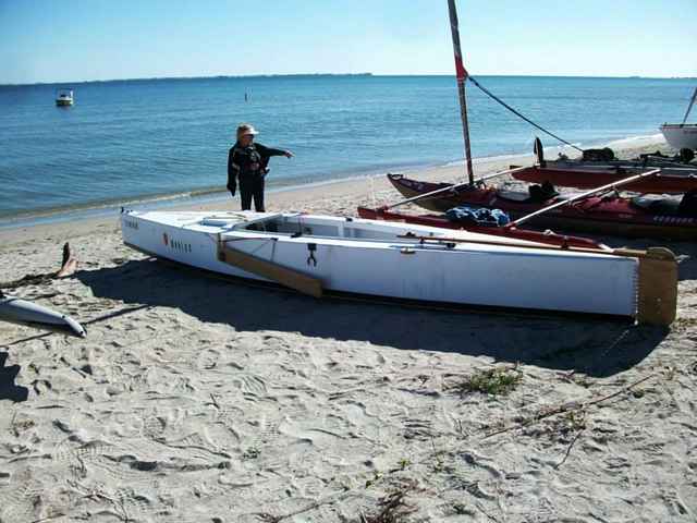 "I probably didn't get to the water for about 30 minutes; I was still tinkering with things," he said. In deference to the good breeze that was blowing at the start, and which soon increased to the predicted 15 to 20 knots from the northeast, John chose to start with just the 60-foot sail set in the middle of the boat. He had no problem sliding his boat to the water, and soon cleared the first hurdle that catches some boats, a shallow bar 40 or 50 feet off the beach.