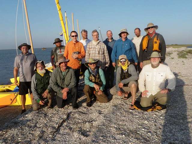 So we all beach on the cut and start fixing our rudders. Slowly with parts from here and there and mainly from Sean Mulligan who seemed to be traveling with a hardware store, we bolted all the pintels on. We all finally got everything working and headed out together. I got to tell you, I was freaking flying, with a capital Freak. The water was smooth in the cut but the winds still up near 25mph. With two reefs in I was doing 7 and peaking at 10. I mean the hull speed is supposed to be 3.5 on these things! The loaner boats would prove to be very very fast boats indeed. Faster than all the other PDR’s out there. This was because: 1) John Wright built a simple awesome design, 2) Andy Linn made awesome sails, and 3) all of us on loaner boats only traveled with carry-on luggage so we weren’t packed down with a bunch of equipment. We screamed into the campsite and it was only 3pm! The shortest day of the trip was done. Gordo passed out cold beers to us all! I gave bill a birthday card from granddaughter Darcy and gave him a pack of horribly sweet cigars.