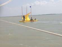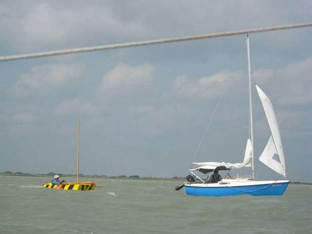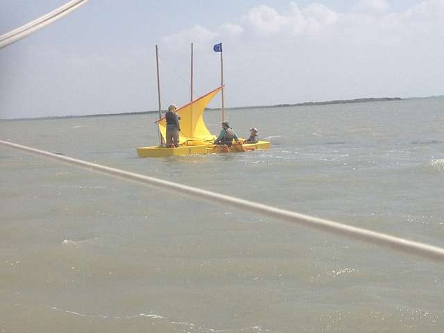 Josh and Andy had both lost they’re rudders. Honestly, I was worried about Josh. Even though he is from Small Craft Advisor’s I was sure he was not used to this kind of rough treatment and losing his rudder. Would he prove to be sailor enough to deal with this? Well Yes, he was. Chuck the Duck came and lashed himself to Josh on one side and Andy on the other and then they made the first ever PDR Tri! It was a thing of ignoble beauty! They made it to the cut along with everyone else. Two other quick stories first from the Red Fish Bay.