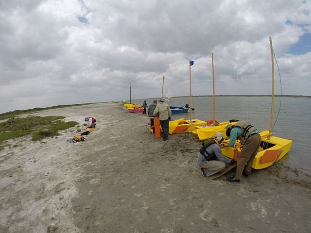 I arrived and was picked up by John Wright, aka St. John of Bastrop. Wow that guy has a million and one stories. He picked up Wade Tarzia at the same time. Wade was sailing John’s original PDR that he sailed the T200 in which started these shenanigans in 2008. It seemed like every field we drove by John would say something like; “that’s cotton. I picked cotton one day. They let me do it because I wanted to make some extra money. I worked all day and made 80 cents. That was the last time I picked cotton.” His knowledge of the area is encyclopedic. It was a pleasant drive. Meanwhile, Bill had been finishing the PDR loaners at Chuck’s place. The same day I was driving down, Bill and Chuck were also. We got down to the start and went to the condo that Chuck Pierce had rented out which would act as our final outfitting and rigging grounds. It was nice to have such a place to ourselves.
