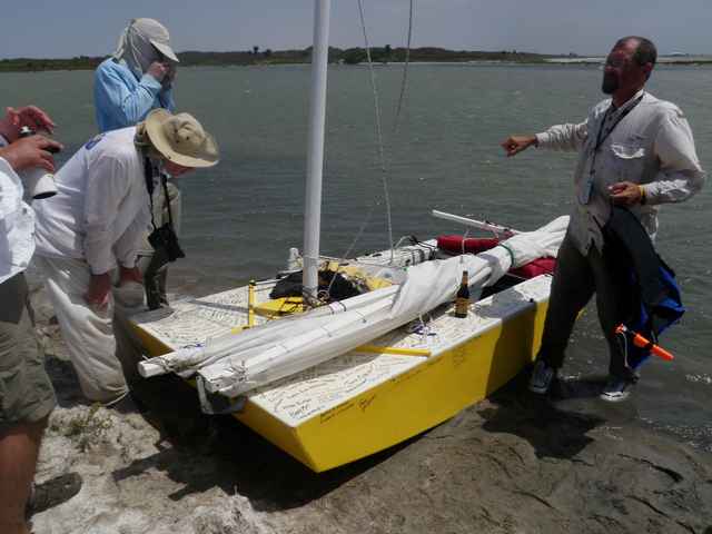 Now will begin the long hot times of unloading and setting up, or said another way, the dues small-boat sailors must pay. The team with whom I sailed were helping out the Live Strong cancer fund raiser. Several Ducks were built by John Wright and Bill Moffitt, transported by Chuck Leinweber, with sails by Andy Linn, just for the fund raiser; a few sailors had previously built their own, personalized in various ways. Mine was made by John for his own Texas 200 duck adventure in 2008, the first time these craft were tried on the cruise. Most are painted yellow, and one is designed to look like a 57 Chevy complete with working lights and blinkers, just for the fun of it. John Goodman, artist and builder, showed off all of its luxury features to Coast Guard guys we met a few days later; they were geared-up like a SWAT team and were not amused, having eschewed that elective class at the Academy, 'CG101: Humor on the Job'.