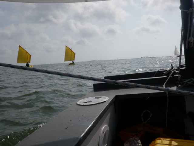 Scott Widmier will frequently drop by to chat. He and John belong in the same tribe because they have both started their own Puddle Duck legends - in 2008 John abandoned his comfortable route to help other Duckers find their way, and they all ended up camped in some godawful spot (something to do with wakes from barges and sexually aroused crabs), and Scott because he got a good ways along an Everglades Challenge (300 mile, multi-day small-boat race) in his Puddle Duck before suffering pitchpole and equipment loss (a lot of boats dropped out during that year's stormy event, 'a lot' meaning more than the usual 40%). His unique and fast-sailing 12 foot cabin-scow needs no work, and he has time to chat and loan me a mast (thanks again!), because in the rush and complications, my mast has been left in Bastrop County. You can leave the dock without a lot of things, but a mast is part of the "minimum required equipment list." However, Scott also has a large vehicle carrying, evidently, a small chandlery, and he has a fine carbon mast-half from his windsurfer perfect for my boat. John has a sheet-steel drainpipe that slips inside the carbon tube (note to self: ask him why someday), so I sailed with a steel-carbon hybrid rig previously unknown in the sailing world.