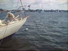 As the boat goes around and around it takes an hour or two every month or two to untangle the rodes (I believe this is a version of Bahamian Mooring). I no longer use the motor to 'set' the anchors. Instead I rely on the weight of the anchors and chain to settle into the bottom and subsequently be able to resist the fierce south Florida summer squalls and the winter cold fronts. In a much rarer hurricane I will have so many anchors and all that chain on the bottom as well as several ropes into the mangroves that the motor would serve no use. However, I do rely heavily on my old and much abused 8 foot hard dinkey to run and then pick up all that stuff.