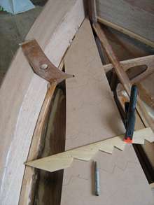 Note that where there is a break in the curve, such as would be where the line of the seat top crosses a chine or plank lap join, run your batten from that angle to the next, you cant put a batten around that angle so do the curve on each side separately.