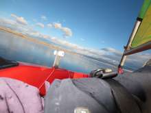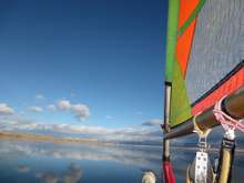 The prediction for Sunday is big! A front is approaching, wind fifteen to twenty, gusting to forty, with precip likely. By ten we're at the boats, and it's on! We rig the little sails, and we're off! No significant cloud cover, a few squalls pass through occasionally spitting snow or rain, but it's mostly sun and rapidly rising temps. I'm in heaven! The locals show again, rig, and scream around with us a while, but these conditions are brutal, with the gusts hitting hard, easily ten to fifteen knots over the mean wind speed, which is in the high teens. A bit much for those without the ability to shorten sail, so attrition sets in. Although it's less than relaxing, I revel in this kind of sailing, the challenge of maintaining control in out of control conditions, while attempting to squeeze out as much speed as I dare. Load the boat up too much and the rear end breaks free. Violently, I learn! One puff hits ferociously while already travelling over fifty, and slams the boat into a 540 degree spin, nearly capsizing, then decelerating slowly, backwards, while I try to catch my breath! John's right behind me, and gets a front row seat.