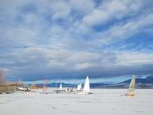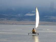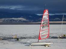 We can run down the shoreline a ways and get into smoother ice. Nice ice, hard ice, fast! Not a huge amount of breeze, maybe 10, but with this surface the boats are getting into the thirties, always exhilarating, particularly with sunshine and temps in the forties! The locals are soon satisfied, and they wander off. But John and I rarely see these conditions, and we blissfully sail into another grand Montana sunset.