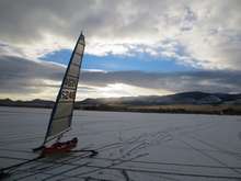 Another pilgrimage eastward, in search of solid water. To Canyon Ferry, east of the continental divide, iceboating Mecca of the West. John with his World Championship mini, and I with the Fed 5, both dirtboats decked out with runners for the season. We travel four hours from Lakeside, MT, back down the ramp the early afternoon sunshine, and rig in still air. As we finish, the predicted 6 to 10 shows up and we're off! The ice is four to six inches thick, with stippling of consolidated snow. This big water venue is known for its hazards, and we could see open water on the north end of the reservoir as we drove in. So we cruise about fairly close to the launch, take a break or two, and sail contentedly til the light fails. The trip is already a success!