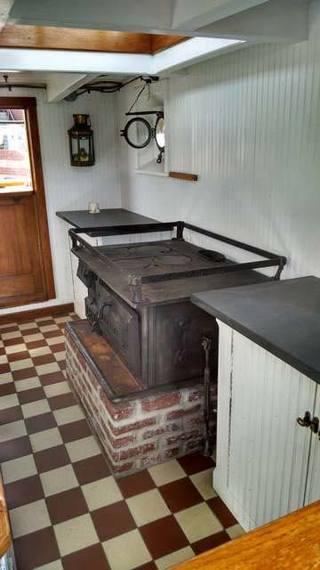 We peek inside the galley on deck, a narrow space with stove and counter.