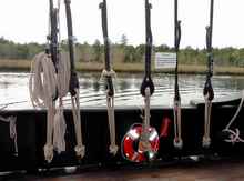 The hulls are black, Kodros explained, because in 1492 the ships would have been covered in sticky, black, flammable pine tar to help in waterproofing and fighting hull-eating worms. The 65-foot Nina displaces 75 tons and carries 20 tons of ballast stones. (Pinta is 85 feet and 101 tons. The third ship of Columbus' fleet and the largest, the Santa Maria, has not been rebuilt. It was wrecked on Columbus' initial voyage, forcing him to leave some of his crew before returning to Europe. They had disappeared when he returned on his second voyage.) The rudder extends seven feet into the water and is steered with a giant, deck sweeping tiller. Kodros noted that wheel steering had not been invented in Columbus' time.