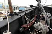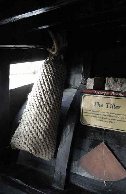 Nina's impressive tiller. Long enough to be handled by one person. This covered stern deck was the primary shelter for the crew. |