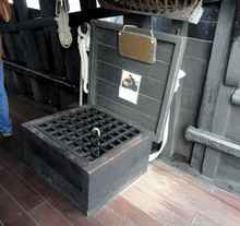 Some period details: a fender made of scrap rope. A sample of the ballast stone stored in the bilge, and the sea quadrant used for navigation. |