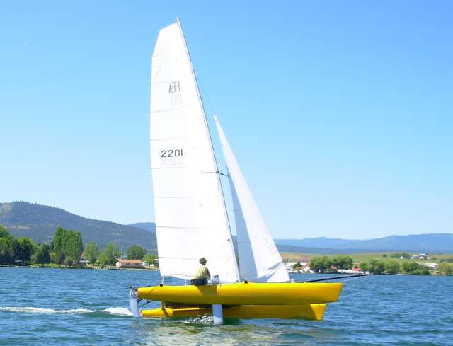 Brad rouses me from a fitful slumber at 7:30 the next morning. It's just getting light, blowing maybe 10 to 15 now. It was still in the high 20s most of the night, I could hear the surf from the cabin whenever I awoke. Reed picks us up at the dock 15 minutes later, and we motor into the adjacent bay. There she lies, disturbingly bow up. Either the mast is on the bottom, or there's a lot of water in the sterns. Both, it turns out. But after some frustrating untangling of the mass of lines entwining the boat, we again attempt to pull her bows over sterns, and she pops right up. A measured tow back home, a slow pull up the beach to allow the hulls to drain, a little breakfast, and a couple hours later she's on the trailer and headed for her winter digs. A few dollars, a bit of love, and the Lunatic Fringe will once again challenge Flathead Lake.