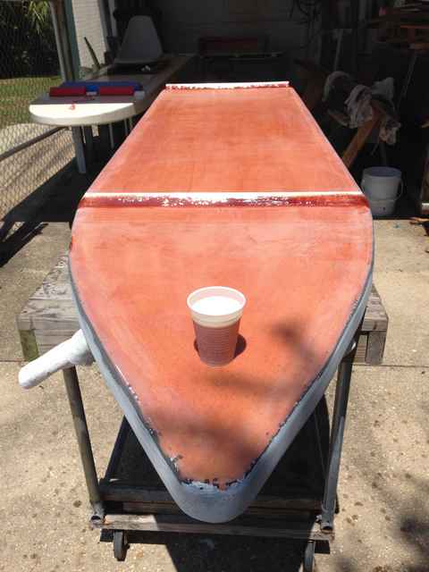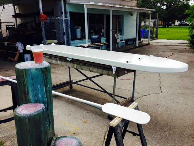 I knew I needed some way to tie stuff to the board and to be able to tie it down to transport it. After a little thought I decided to fiberglass some PVC horizontally to the board. That would allow a lanyard through to use for the aforementioned needs. It would also offer a potential opportunity to slip another piece of pipe or dowel through it to use as an axle like place to apply wheels, fins, backstays for a sail, flip up or down seat. I applied a quick coat of primer and one coat of Rustolium-Topsider paint that is sells for $11 a quart at Lowes along the coast here in Florida.