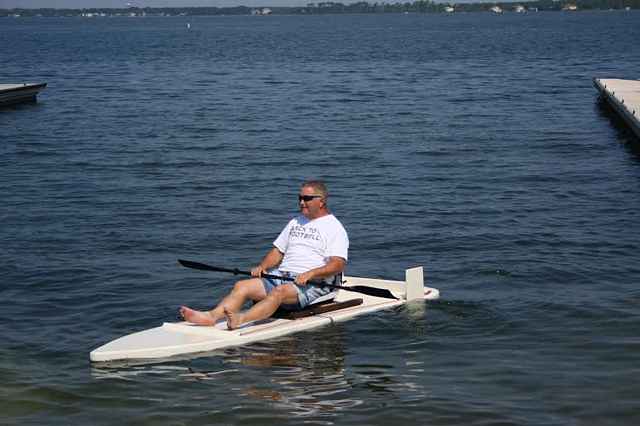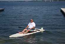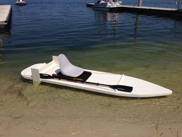 The board worked great and I was able to stand up almost 57 minutes per hour with the missing 3 minutes being in the water trying to get back aboard. The good news is even I was able to reboard the SUP from water deeper than me. Back at the shoreline I sat the removable seat on it and paddled it like a Kayak. It was so stable I would venture to say it would have required a purposeful effort to fall off or flip in sit-down mode. I decided my next one would be a little smaller and maybe make the bow pointed instead of round in case I took it out in the chop and needed to part the water. At the speeds I experienced I decided there was little to be gained by adding any rocker to the shape other than the slight upward shape I had sanded in the bottom of the bow.