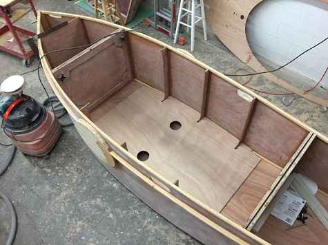 Andy Linn's modified Oz Goose going together at the Toledo Community Boathouse. He will use it for distance events like the Texas200 and local sailing for thrills when much more lightly loaded! See more on Andy's website.