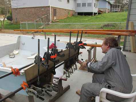 Master of "clampology", Steve Ladd, gluing up a new transom for my Spindrift 11 dinghy.