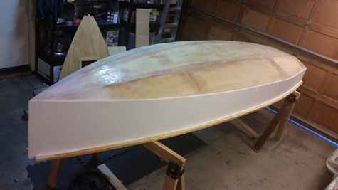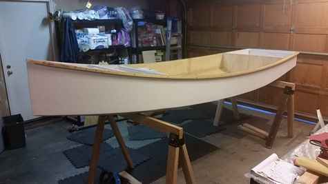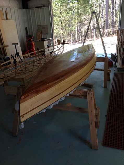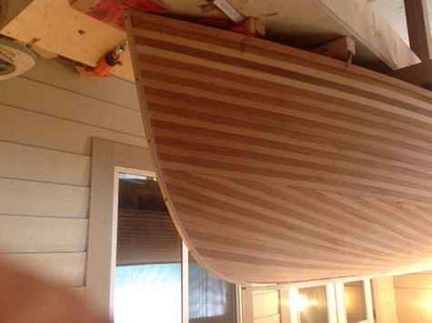 I'm building the Cosine Wherry row boat from the Rip, Strip & Row book. I've been at it for about two years now. I milled all the strips myself. I'm at the fiberglassing stage. I'm waiting for the right temperature. I think I'll have to take that nice stem strip off and re fit it with the keel strip+ skeg after I'm finished the fiberglassing.