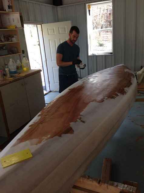 We wet out a layer of glass on the stripper today. Got good contrast between radiata pine and red cedar.