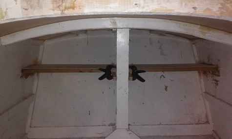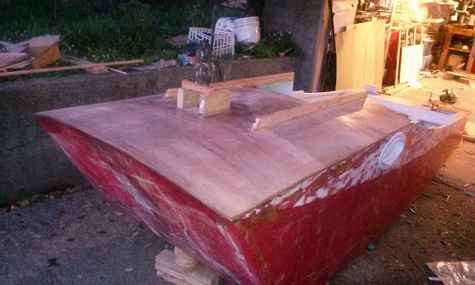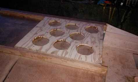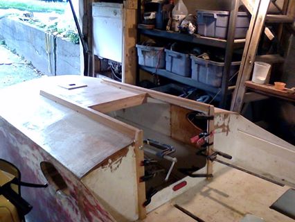 More work on the Oozegooze 1. The new cabin roof is in, and skim coated with epoxy. I've also taken the remainder from the 3/4 inch plywood for the hatch insert reinforcement, and after cutting a few holes to lighten it, it is taking the place of the interior supports for the hatch. It'll get another layer of 1/4" meranti on top of what you see, and it should be bulletproof. I'm going stronger because of a glue failure on the original, and I know my 9 year old will try to stand on it some time. I'm also getting the holes drilled for the new hatches attachment hardware. These hatches seriously rock for the price - $20 each. Also, I'm adding a small shelf in the bow, in some unused space - a nice place to stash a book or a chart or anything really. It'll have a bungee net going across it that will hook into the roof.