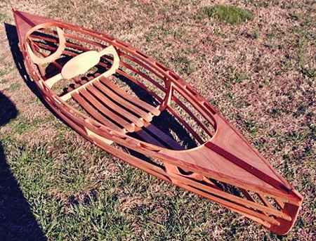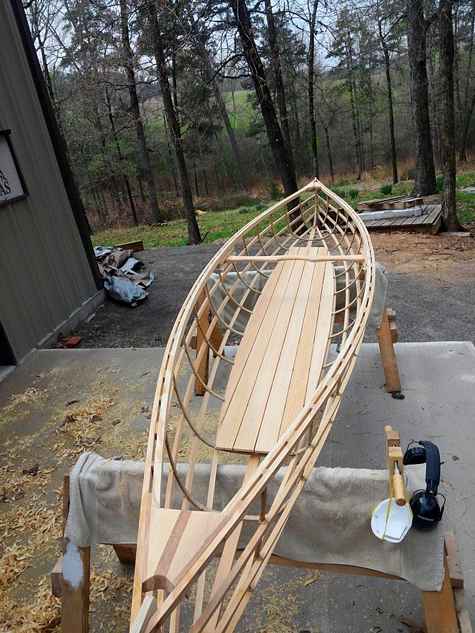 This is Gavin Atkin's Cinderella canoe, lengthened to 14'4", a couple inches of rocker added, and built as a skin-on-frame with steam bent and waxed nylon lashed ribs. With the yoke position I think it may require some gear or two people to trim properly. More on Facebook.