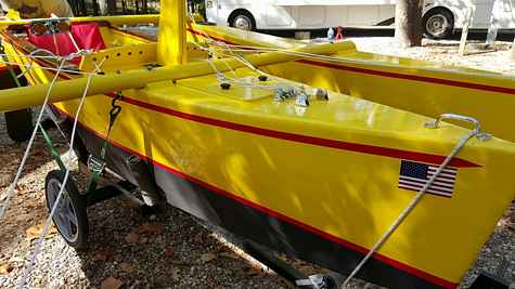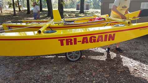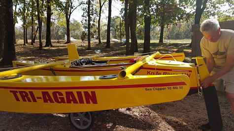 This is the latest boat by Bob Trygg and his wonderful wife Virgene who many of you know as one of the most superb boat builders ever. And prolific, about a boat a year. But this one is really special. Bob had a massive stroke a couple of years ago that many would simply have given up and never recovered from. When he and Virgene pulled into last year's Sail Oklahoma I rejoiced. But this boat made my heart sing with joy. A John Marple design, the name says it all. Bob didn't think he could build another boat but Virgene said no, let's try again, I will help you. And here she is, Tri-Again. This is a salute to two beautiful people and a beautiful boat and a love that keeps going.