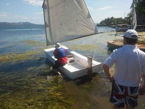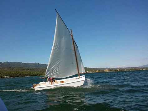 No hiking straps, polytarp sail, broken tiller extension ... but the first Philippines Goose is still trucking on its first sail. Sail drifted a bit far forward too. We will have to add a Landreville type preventer that he has worked out for the lug sail.