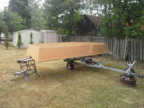 I built a Duckskiff from construction grade plywood and low grade lumber, a first effort at stitch and glue construction. The bottom and sides were made by butt joining two sheets of plywood as per Dynamite Payson. The required "kit" was then cut from the 8 X16 plywood. I used a combination of plastic tie straps and duct tape to hold the boat together while spooning the epoxy 'butter" in the joints as required. The boat was covered with six ounce cloth inside and out, two layers on the bottom. Since the wood is lower grade and not that pretty, I painted it with "Brightsides" oil paint. She gets an early 1990's Two stroke Mercury 9.9 outboard I've had since new. She comes up on plane nicely and as expected pounds in the rough. I'll be using her on the Skeena River for Salmon fishing as I don't hunt.